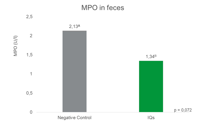 The results indicated that the group receiving IQs showed a decrease in all these biomarkers compared to the control group. In the initial sampling period, a trend suggested that IQs reduced calprotectin levels (figure 1), indicating decreased inflammation in newly weaned piglets. In the second sampling period, notable reductions in both MPO (Figure 2) and cortisol (Figure 3) were observed in the treatment group, reflecting a positive effect of IQs on inflammation and stress management. These reductions align with improved weight gain and FCR, affirming the product’s role in promoting health and performance.