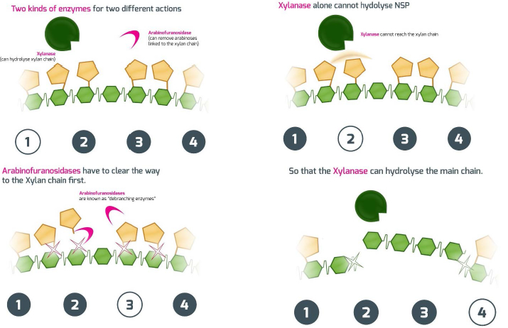 Figure 2: Synergistic actions of Arabinofuranosidase and Xylanase to degrade arabinoxylan chains