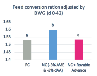 In a recent trial conducted in Brazil, broilers were fed three diets during the 0-42 day period: Positive Control (corn, soybean meal diet), Negative Control (-3% AME & -3% dAA), and Negative Control + Rovabio® Advance. The addition of feedase Rovabio® Advance in the NC diet recovered performance to the same level as the Positive Control (Figure 3). With such reformulation, the feedase supplementation allowed for a reduction of feed costs by $15/t feed treated.
