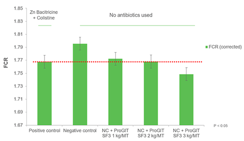A broiler trial was conducted in a controlled environment to demonstrate Eastman ProGIT SF3's potential to reduce the need for AGPs (Zinc Bacitracin and Colistin) without compromising broiler performance.