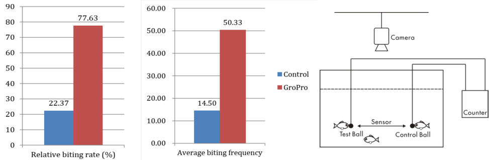 The two-ball method trial is one of research methods on observing feeding behavior of fishes, which is an important method determining palatability performance of feed additives. However, the touch of fish's body to the ball would affect test results during the two-ball method trial. Therefore, video monitoring equipment was used in the trial in order to improve data precision. Through fine experimental study, we found that GroPro significantly increased biting frequency and relative biting rate in Carassius Auratus Gibeli (Fig.1).