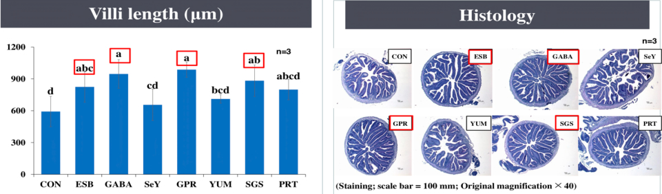 Fig.2. Intestinal histology of juvenile olive flounder fed eight experimental diets for eight weeks: CON control, ESB encapsulated sodium butyrate, GABA, SeY selenium yeast, GRP GroPro, YUM Fyucca meal, SGS song-gang stone, PRT protease.