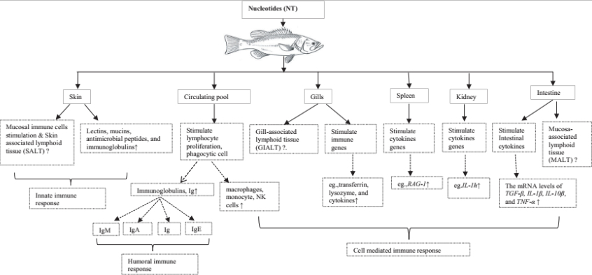 Evidence from animal and human studies supports the theory that nucleotides are important for optimal functioning of several components of the immune system. Research on fish also revealed that exogenous nucleotides can influence both humoral and cellular components of the innate immune system. The exact mechanism of humoral and cellular immune stimulation by dietary nucleotides supplementation has not been elucidated. Dietary nucleotides contribute to the circulating pool of nucleotides available to stimulate leukocytes production which are the important cells of the immune system that protect the body against infectious diseases and foreign invaders (Fig. 3).