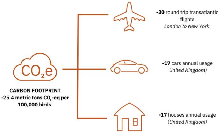Another theme that was highlighted in the broiler meta-analysis was sustainability. To understand whether mycotoxins and YCWE play a role in the sustainability of production, the CO2 equivalent (CO2-eq) was calculated for broilers using results from the meta-analysis. This showed that while a mycotoxin-contaminated diet increased carbon footprint over control-fed animals by an estimated 47 metric tons CO2-eq, the use of YCWE lowered this by an estimated 25 metric tons compared to feeding mycotoxins alone. This is equivalent to a savings of 30 round-trip transatlantic flights (New York to London), or the annual usage of 17 cars in the United Kingdom (Figure 2).