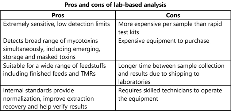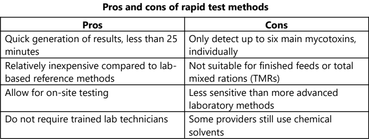 Mycotoxin testing methods can generally fall into two categories: on-site or rapid test systems, and the more sophisticated laboratory-based detection systems. To make a quick distinction between the two, rapid tests are generally used when testing individual raw materials and can typically detect up to six of the key mycotoxins, while lab-based testing is used for more complex feedstuffs such as finished feeds and TMRs and can simultaneously detect a much higher number of mycotoxins.
