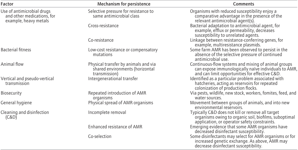 Table 1 summarizes factors, discussed in this and subsequent sections, on the persistence of AMR on farms. Some factors are interrelated such as: animal management systems, opportunities for hygiene controls, and C&D. The transmission and movement of AMR, rather than the generation or selection of AMR in situ by antimicrobial agents, has been observed in several field studies, some of which are outlined in the following section. Identified or postulated routes of transmission included: importation of breeding stock with subsequent transfer down a production pyramid, repeated introductions into groups of young animals from a persistent source (hatchery, adult cattle herd), and movement between premises or areas linked by personnel, stock, vehicles, or wind. Where resistant bacteria appeared not to be closely related, likely sources of AMR included intensive use of antimicrobial drugs, or transmissible genetic elements (plasmids); both of these were associated with hatcheries.