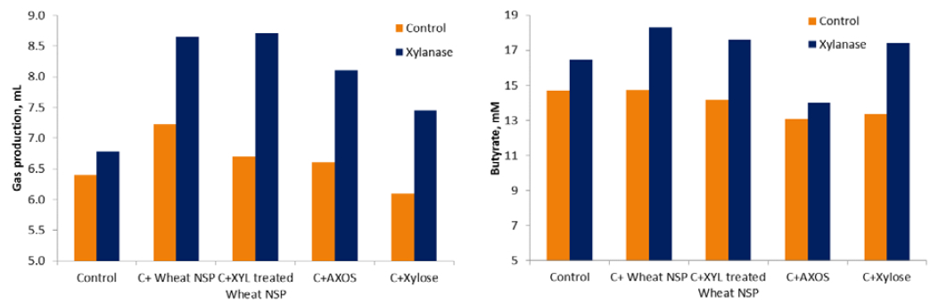 Figure 1. In vitro gas and butyric acid productions when cecal flora from broilers fed either Control diet or xylanase supplemented diet were used as inocula with various substrates. Broiler chickens were fed a wheat-soy diet which contained a xylanase (Econase XT, AB Vista, UK) at 0 or 16,000 BXU/kg for 35 days of age (Bedford and Apajalahiti, 2018).