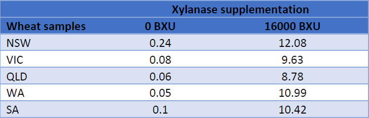 Table 1. Sum of short chain xylo-oligosaccharide (X2-X5, g/100g) production after in vitro simulation of gizzard and small intestinal digestion in different wheat samples without and with xylanase (Econase XT) supplementation (Morgan et al., 2019).