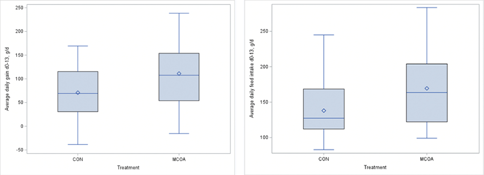 Tetske Hulshof: Overall, the piglets that were fed the diet with the blended feed additive on-top had a similar feed intake to piglets on the control diet. But, despite the similar feed intake, the piglets receiving the feed additive had an improved average daily gain.