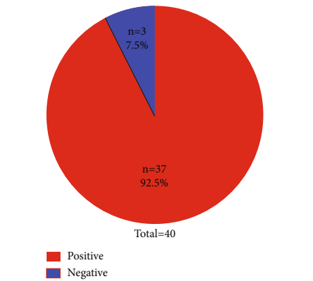 3.1. Frequency of Aflatoxin in Feed Samples in All Samples Collected from Selected Regions of Northern Pakistan. A total of 40 feed samples were analyzed from selected regions of Northern Pakistan. Among all 40 tested samples, 92.5% (n = 37) were found positive for aflatoxin, whereas only 7.5% (n = 3) were negative (Figure 1). Hence, a high percentage of samples contaminated with aflatoxins was evident. 3.2. Regions-Wise Frequency, Total Aflatoxin Level, and Moisture Content in Poultry Feed Supplied to Northern Pakistan. The frequency of aflatoxin was also determined in selected regions (Mansehra, Oghi, and Balakot) of Northern Pakistan. The highest frequency of aflatoxin was reported in samples obtained from the Balakot region where 100% of feed samples were contaminated with aflatoxins. The samples obtained from the Mansehra region showed 96.0% of contamination, while those collected from the Oghi region had 80% aflatoxin contamination (Figure 2(a)). Mean aflatoxin level in parts per billion was highest (54.56 ppb) in the Mansehra region, followed by the Balakot region (46.5 ppb) and Oghi region (44.8 ppb). There was no significant difference when mean parts per billion values were compared between each region (Figure 2(b)). The highest percentage of moisture content was detected in Balakot (9.56%), followed by Oghi (9.43%) and Mansehra (8.41%). Mean values of Balakot region were significantly higher when compared with Mansehra (with a p value of 0.015 by Student's unpaired t-test), whereas the rest of the comparisons did not reveal any statistical difference (Figure 2(c)).