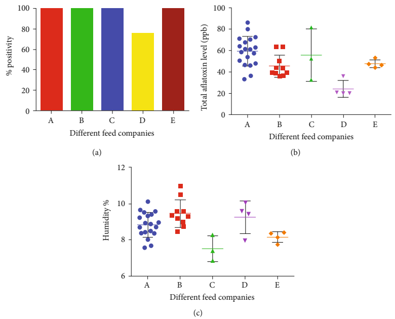 Figure 4: (a) Frequency, (b) total aflatoxin level, and (c) moisture content in poultry feed of different companies. Results shown in (a) are represented in percentages, whereas results in (b, c) are shown as mean ± SEM of parts per billion and percent humidity of 40 samples tested.