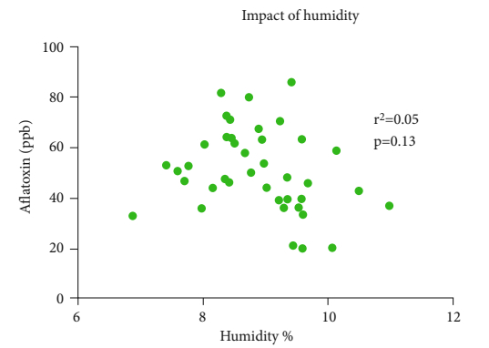 3.5. Correlation between Total Aflatoxin Level and Moisture Content. Correlation between moisture content and aflatoxin level was evaluated by drawing a scattered graph. Pearson's correlation coefficient revealed no significant degree of correlation between these two parameters. r2 was 0.05 with p value of 0.13 (Figure 5).
