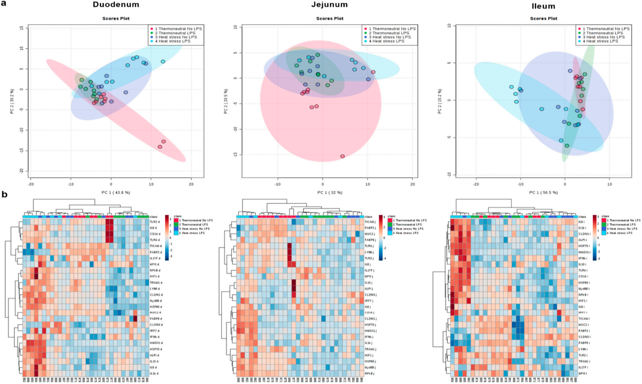 Figure 3. Principal component analysis (PCA) plots (a) and heat maps (b) of the expression of all measured genes in the duodenum, jejunum, and ileum of broiler either kept under thermoneutral conditions (10 h, 23 ◦C) or kept under heat stress conditions (10 h, 36 ◦C) receiving an oral dose of saline (0.9%; no LPS) or LPS (1 × 2 mg/kg b.w.). n = 8 animals/treatment.