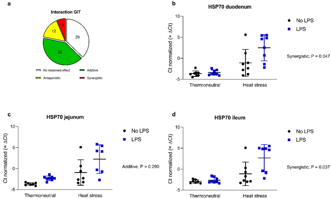 Figure 4. Summary of the number of interactions in the gastrointestinal tract (GIT) (a). Interactions of treatment factors on the delta Ct values of heat shock protein 70 (HSP70) in the duodenum (b), jejunum (c), and ileum (d) of broilers either kept under thermoneutral conditions (10 h, 23 ◦C) or kept under heat stress conditions (10 h, 36 ◦C) receiving an oral dose of saline (0.9%; no LPS) or LPS (1 × 2 mg/kg b.w.). n = 8 animals/treatment. Values present means with standard deviation.