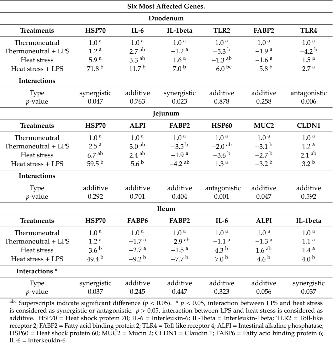Table 3. Fold change of the expression of the six most affected genes in the duodenum, jejunum, and ileum of broilers either kept under thermoneutral conditions (10 h, 23 ◦C) or kept under heat stress conditions (10 h, 36 ◦C) receiving an oral dose of saline (0.9%; no LPS) or LPS (1 × 2 mg/kg b.w.). n = 8 animals/treatment. Thermoneutral group was set to 1.0.