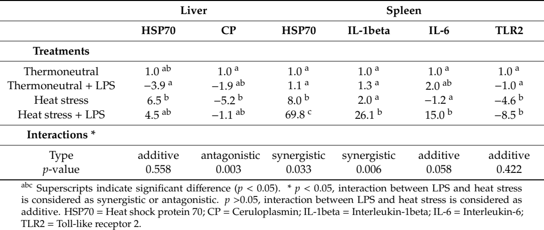 Table 4. Fold-change of the expression of affected genes in the liver and spleen of broilers either kept under thermoneutral conditions (10 h, 23 ◦C) or kept under heat stress conditions (10 h, 36 ◦C) receiving an oral dose of saline (0.9%; no LPS) or LPS (1 × 2 mg/kg b.w.). n = 8 animals/treatment. Thermoneutral group was set to 1.0.