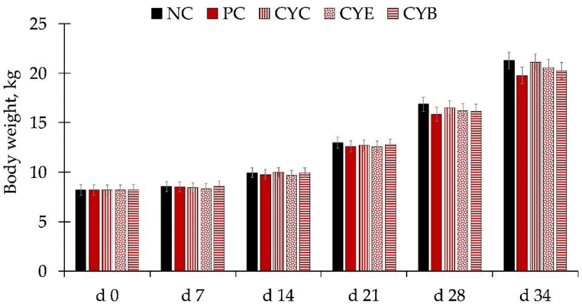Figure 1. Body weight in newly-weaned pigs consuming diets with (PC, positive control diet with 3.2 mg/kg of deoxynivalenol) or without deoxynivalenol (NC, negative control diet with 1.2 mg/kg of deoxynivalenol) and diets with deoxynivalenol and mycotoxin detoxifiers at 0.2%: CYC (PC + clay/yeast culture-based product); CYE (PC + clay/yeast cell wall/plant extracts/antioxidants-based product); and CYB (PC + clay/inactivated yeast/botanicals/antioxidants-based product).