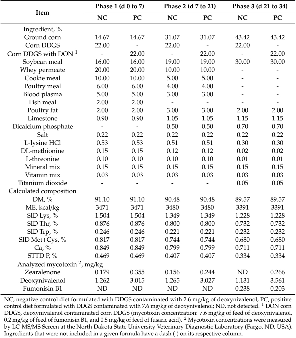 On day zero, 30 barrows and 30 gilts weaned at 27 days of age (8.20 ± 0.10 kg) were allotted to 5 dietary treatments (n = 12), based on a completely randomized block design according to sex and body weight (heavy, medium, and light). Pigs were assigned to individual pens with metal screen floors, equipped with a nipple drinker and a feeder. Each pig received one of the following 5 diets for 34 days: (1) a diet with corn DDGS containing 1.2 mg/kg of deoxynivalenol (NC), (2) a diet with corn DDGS contaminated with deoxynivalenol to supplement 2 mg/kg deoxynivalenol (PC), (3) PC + clay/yeast culture based product, at 0.2% (CYC); (4) PC + clay/yeast cell wall/plant extracts/antioxidants based product, at 0.2% (CYE); and (5) PC + clay/inactivated yeast/botanicals/antioxidants based product, at 0.2% (CYB). Experimental diets were formulated to meet or exceed the nutrient requirements suggested by NRC (2012), following a 3-phase feeding program (Table 6). All experimental diets were sampled (from 9 different locations, totaling 2 kg per diet) and 200 g of each were sent to North Carolina Department of Agriculture (Raleigh, NC, USA) for proximate analysis, and another 200 g of each was sent to North Dakota State University Veterinary Diagnostic Laboratory (Fargo, ND, USA) for determination on mycotoxin concentration (Table 7. Feed ingredients, calculated, and analyzed composition of experimental diets with (PC) or without mycotoxins (NC), in a three-phase feeding program fed to newly-weaned pigs for 34 d, based on a 3-phase feeding program.). Mycotoxins were extracted from feed samples by acetonitrile:water (84:16, v/v), filtered, and then screened by liquid chromatography-mass spectrometry/mass spectrometry (LC-MS/MS) for mycotoxin detection. The NC diet had deoxynivalenol because corn DDGS used in the NC diet also included deoxynivalenol. However, the concentration of deoxynivalenol in PC still had 2 mg/kg more deoxynivalenol than NC, as planned.