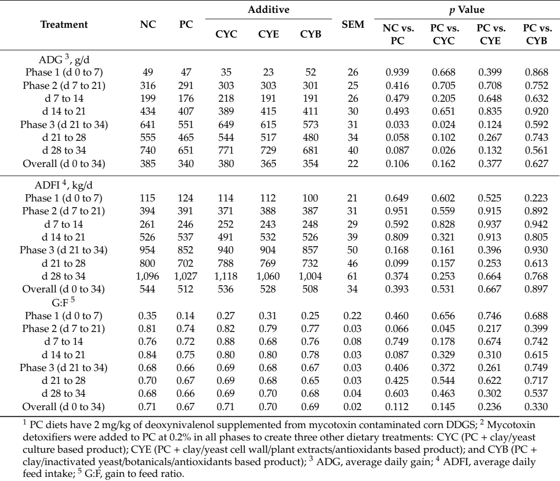 Feeding a deoxynivalenol contaminated diet with 3.2 mg/kg of feed did not show major impacts on growth performance in weaned pigs during 34 d. Deoxynivalenol is a mycotoxin known to depress animal feed intake [43] and may cause vomiting [7], resulting in impaired animal growth [44]. Indeed, in the review prepared by Pestka [11], reduced feed intake and growth are characteristics of deoxynivalenol chronic exposure, as observed in the current study, due to the upregulation of proinflammatory cytokines by p38 MAPK induced activation. Whereas vomiting is observed under acute exposure mediated by the increase in serotonin and peptide YY, where the latter also plays a role in appetite inhibition [7,43]. Considering that our research group has been performing related investigations, the number of replications and the mycotoxin concentration were expected to result in impaired animal growth [8,25,26,45,46]. Thus, it can be hypothesized that deoxynivalenol concentration in the NC diet (1 mg/kg of feed), could have impaired growth performance of pigs and was masking the outcomes observed in comparison to pigs fed PC. Supporting this hypothesis, it was observed in previous studies that deoxynivalenol concentrations of 0.6 mg/kg in naturally contaminated feed can impair the growth performance of pigs [8,24]. Thus, deoxynivalenol toxicity in PC treatment in comparison to NC was not able to elicit acute and marked differences in the growth performance of pigs.
