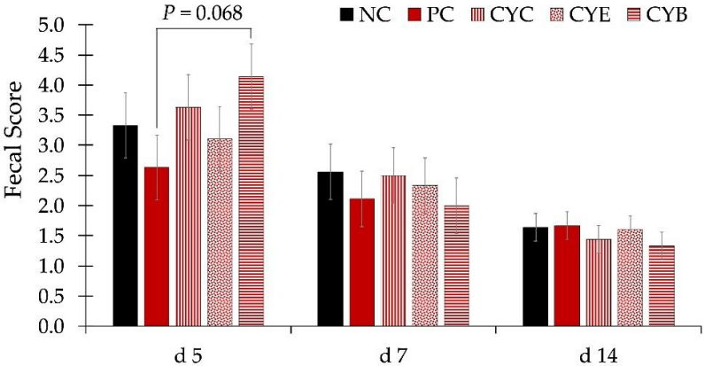 The average high and low temperatures were 30.4 and 27.5 °C, with 74.6% specific humidity over the course of the whole experiment. There were no differences in the body weight of pigs among treatments during the whole experiment (Figure 1). Pigs fed PC (positive control, 3.2 mg/kg of deoxynivalenol) presented a tendency for lower average daily gain (ADG) from d 21 to 28 (p = 0.058) and d 28 to 34 (p = 0.087), and significantly lower (p < 0.05) during the whole phase 3 (d 21 to 34), in comparison to pigs fed NC (negative control, 1.2 mg/kg of deoxynivalenol; Table 1). Pigs fed PC presented a tendency (p = 0.099) for lower average daily feed intake (ADFI) from d 21 to 28, in comparison to pigs fed NC. Pigs fed PC showed a tendency for lower gain to feed ratio (G:F) during phase 2 (d 7 to 21; p = 0.066) and from d 14 to 21 (p = 0.087) in comparison to pigs fed NC. Pigs fed CYC (PC + CYC product at 0.2%) had greater (p < 0.05) ADG during phase 3 (d 21 to 34) and from d 28 to 34, than pigs fed PC. Pigs fed CYE (PC + CYE product at 0.2%) showed a higher fecal score than pigs fed PC on d 5 (Figure 2). There were no differences in the fecal score among pigs from experimental treatments on d 7 or 14.