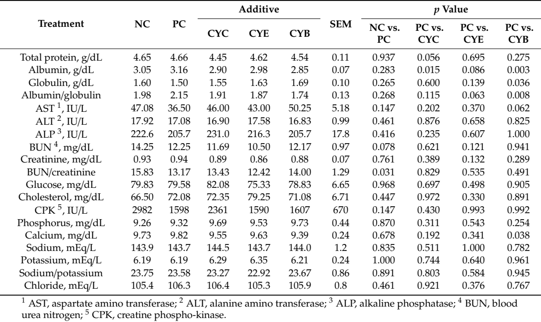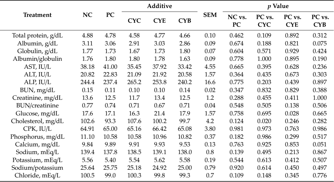 On d 34, a blood serum assessment of proteins, metabolites, and electrolytes showed that pigs fed CYC had higher glucose and tended to show lower creatine phosphokinase than pigs fed PC (Table 3). Pigs fed CYE had higher (p < 0.05) blood urea nitrogen to creatinine ratio than pigs fed PC. Pigs fed CYB showed a tendency for lower creatine phosphokinase (p = 0.071) and calcium (p = 0.051) than pigs fed PC.