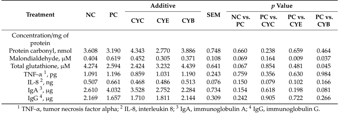 At the end of the study, d 34, pigs were desensitized by penetrating captive bolt and euthanized by exsanguination of the vena cava. Intestinal samples were collected 3.5 m after the duodenum, delimited by the end of the anatomical association between duodenum and pancreas, and considered as mid-jejunum [51]. Samples of gut mucosa were scrapped from 15 cm sections from mid-jejunum and stored at −80 °C until laboratory analysis. Antioxidant status, immune response, and intestinal barrier function were evaluated in gut mucosa by quantifying protein carbonyls (STA-310, Cell Biolabs, Inc., San Diego, CA, USA), malondialdehydes (STA-330, Cell Biolabs, Inc., San Diego, CA, USA), total glutathione (STA-312, Cell Biolabs, Inc., San Diego, CA, USA), tumor necrosis factor-alpha (PTA00, R&D Systems, Inc., Minneapolis, MN, USA), interleukin 8 (P8000, R&D Systems, Inc., Minneapolis, MN, USA), immunoglobulin G (E100-104, Bethyl Laboratories, Inc., Montgomery, TX, USA), and immunoglobulin A (E100-102, Bethyl Laboratories, Inc., Montgomery, TX, USA). The protocols provided by the kit manufactures were followed for determining the relative concentrations to protein content (PierceTM BCA Protein Assay Kit, Thermo Fisher Scientific, Waltham, MA, USA) determined from the same samples.