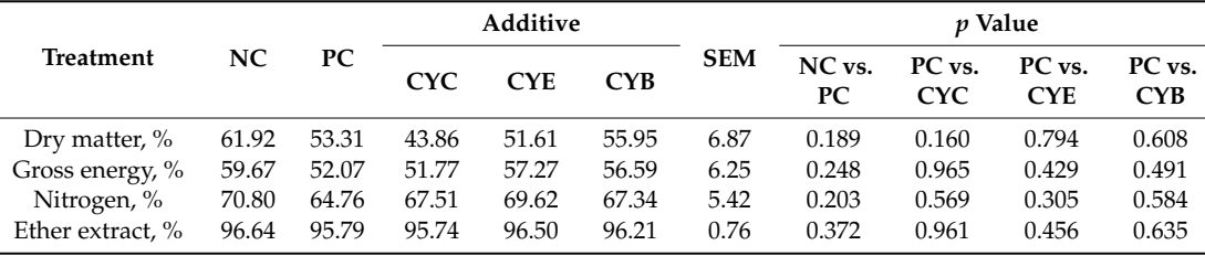 Ileal digesta collected on d 34 was stored at −80 °C until processing for lab analysis: freeze-drying and grinding. Dried and ground ileal digesta samples were analyzed for the apparent ileal digestibility of dry matter [73], gross energy (6200 Calorimeter, Parr Instrument Company, Moline, IL, USA), nitrogen (AOAC method 990.03, [74]), and ether extract (AOAC method 920.39, [74]).