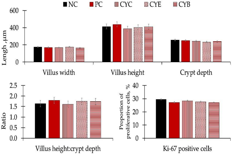Pigs fed PC tended to have a higher concentration of malondialdehydes (p = 0.069) and to have lower total glutathione (p = 0.067) in mid-jejunal mucosa, in comparison to pigs fed NC (Table 4). Pigs fed CYC tended to present lower (p = 0.079) interleukin 8 than pigs fed PC. Pigs fed CYE had lower (p < 0.05) malondialdehydes than pigs fed PC. Pigs fed CYB had lower (p < 0.05) malondialdehydes and higher (p < 0.05) glutathione than pigs fed PC. Pigs fed CYB tended to have lower (p = 0.081) immunoglobulin A than pigs fed PC. There were no differences in protein carbonyls, tumor necrosis factor-alpha, or immunoglobulin G in the mid-jejunal mucosa of pigs among experimental treatments. There were no differences in apparent ileal digestibility for dry matter, gross energy, nitrogen, and ether extract (Table 5), or for morphology or estimated proliferative rate of enterocytes in the crypt after Ki-67 staining performed in histology sections from the mid-jejunum (Figure 3) of pigs among experimental treatments.