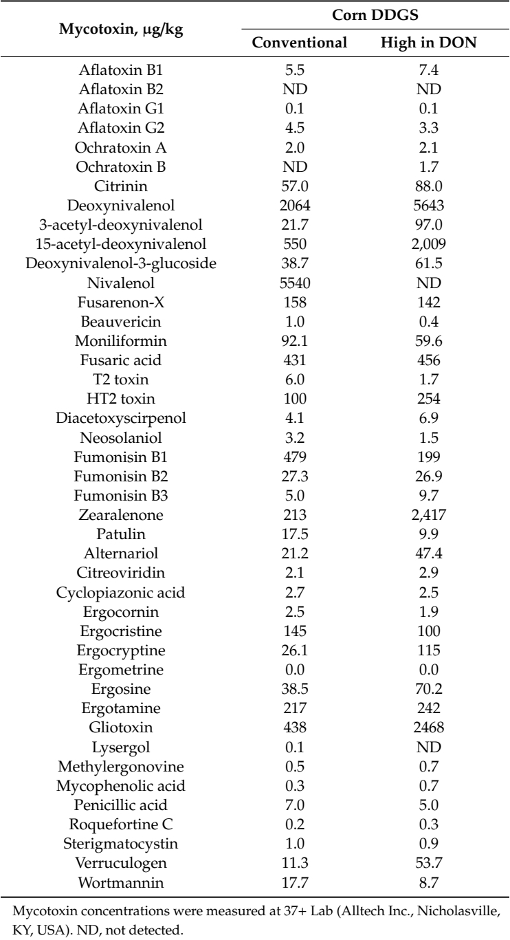 Table 6. Concentrations of detectable mycotoxins in conventional dried distillers grains with solubles (DDGS) or high in deoxynivalenol (DON) contamination DDGS used for diet formulation to newly-weaned pigs for 34 d, based on a 3-phase feeding program.