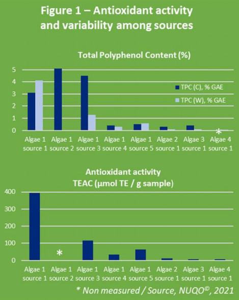 To illustrate the variability of ingredient, a recent work was achieved (See figure 1) to measure the antioxidant activity of phlorotannins from various seaweeds and various geographic origins. Phlorotannins are a type of polyphenols found in brown algae such as kelps, and that can only be found in seaweeds. In the present example, one can see that between seaweeds or even for the same species, variability can be very high. The same applies to other plants. This is why formulators needs to carefully select the source and the quality of antioxidant to guarantee a consistent quality and efficacy in feed.