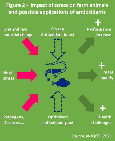 Animals face every day various kind of stress: change of diet or raw material quality, hot temperature, diseases, handling and manipulations … Stress triggers the production of free reactive radicals in cells which oxidize lipids or proteins. These free radicals are normally regulated but under stress conditions, free radicals’ level can increase dramatically and results in significant damage to cell structures and, to some extent, affect the performance and/or health of animal, incl. fish and shrimp species.