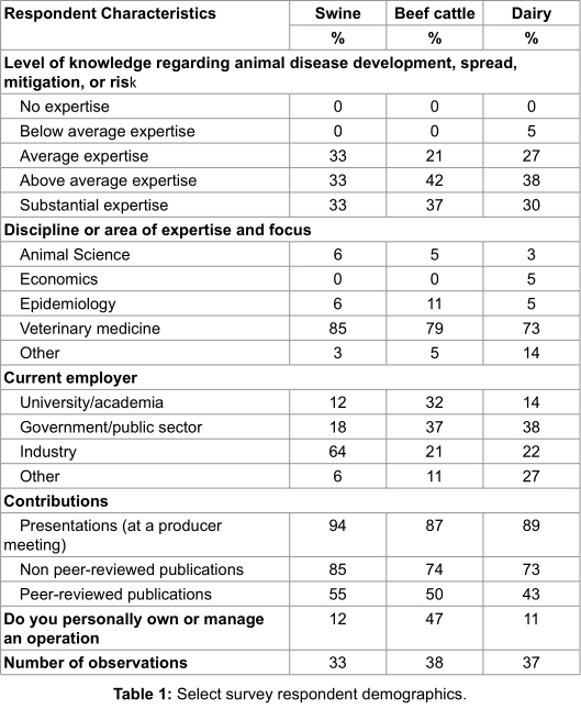 Of the possible 2,743 experts contacted to complete the survey(s), 190 completed questionnaires—55 experts from the swine industry, 70 experts from the beef cattle industry, and 65 experts from the dairy industry (6.93% effective response rate). However, several surveys were only partially completed. For the analysis, 33, 38, and 37 surveys completed by swine experts, beef cattle experts, and dairy experts, respectively, were used. Descriptive statistics of the demographics (i.e., discipline, employment, and biosecurity expertise) of respondents are shown in Table 1.