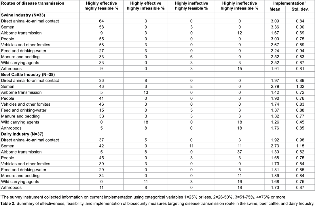 Rating of effectiveness, feasibility, and implementation of biosecurity measures targeting specific disease transmission routes are summarized in Table 2 for the swine, beef cattle, and dairy industries, respectively.