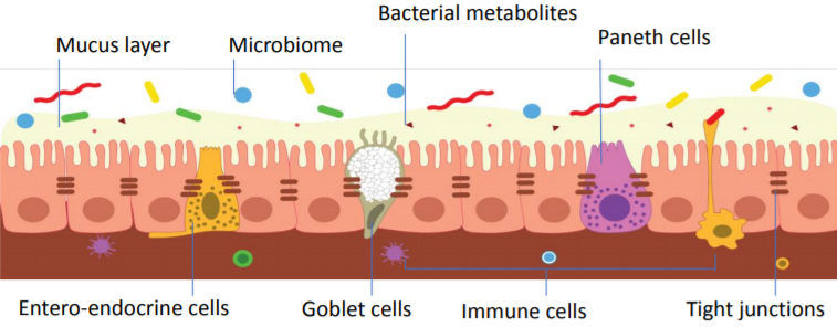Figure 1: The intestinal barrier elements that protect the animals from the action of pathogens, toxins, and other harmful agents