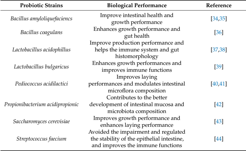 The pathogen most prevalent in the intestines of chickens, particularly broilers, is Salmonella. Therefore, probiotics have been potential candidates for growth promoters in the majority of commercial poultry diets since the withdrawal of antibiotic growth enhancers in poultry nutrition. Antibiotic growth promoters act by blocking the production and secretion of pro-inflammatory cytokine-degrading intermediates in the gastrointestinal tract, resulting in the disturbed gut microbiota [26]. Probiotics, on the other hand, alter the gut environment and strengthen its barrier function through the immune system stimulation, as presented in Table 1 [27]. A total of 280 females of Japanese quails were fed with a mixture of without rapeseed meal, non-fermented post-extraction rapeseed meal (5%, 10%, 15%), and a fermented one (5%, 10%, 15%). The data analysis revealed that the addition of 10% fermented rapeseed meal had the most beneficial effects as such egg quality traits as egg weight, specific gravity, yolk index and color, and albumen pH [28]. In broilers, probiotic non-pathogenic bacteria compete with the pathogenic ones for nutrients in the gut. They also colonize the intestines, preventing pathogenic bacteria from inhabitation and stimulating the secretion of digestive enzymes (e.g., β-galactosidase, α amylase), thus facilitating the absorption of nutrients, and enhancing broiler growth performance [29]. An increased average dietary feed consumption and conversion result in an improved body weight gain, which in turn affects production performance, even though probiotics do not always significantly influence feed consumption and feed conversion. All of the abovementioned processes depend on several factors, including strain selection and application, time concentration, as well as the absorption of dietary probiotics [30]. An increased average dietary feed consumption and an enhanced feed conversion efficiency are closely attributed to an improvement in body weight gain, which in turn complements production performance [31]. The application of dietary supplementation of probiotics improves body weight gain and feed conversion, even though probiotics do not always significantly enhance feed consumption [32]. The body weight gain, average daily diet consumption, feed conversion efficiency, and production performance of the poultry birds are influenced by several potential factors including strains selection, application, time concentration, and absorption of dietary supplementation of probiotics [33].
