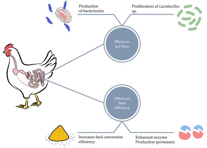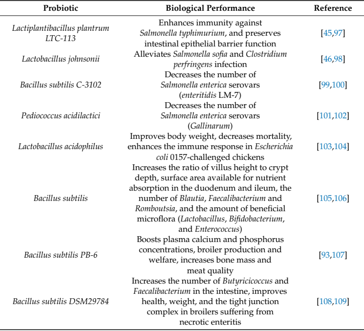 Over the past seventy years, the improvement of feed consumption and genetic selection have been the primary areas of poultry research [1]. The control of a variety of microbial infectious diseases caused by Streptococcus, Staphylococcus, Escherichia coli, Pseudomonas, Campylobacter, Salmonella, Yersinia, Bacillus, Clostridium, Mycobacterium, Enterococcus, Klebsiella and Proteus species has been less thoroughly investigated [2]. The immune system of broilers is not fully developed during the first few weeks and therefore it is more susceptible to bacterial infection [3]. Furthermore, it can take up to eight weeks for the gut microbiota to develop and stabilize. The longer the time necessary to reach bacterial homeostasis, the greater the risk of bacterial infection [1]. Poultry are kept in closed facilities to minimize the risk of bacterial infection [4]. In many cases, farmers continue to supplement feed with antibiotics [5]. In the past decades, in traditional commercial poultry production, antibiotics have been one of the most frequently used additives to improve feed conversion, growth rate, and bird health, thereby increasing profitability and productivity [6,7]. Poultry constitute the largest global population of food animals [8]. Antibiotics kill susceptible bacteria (microbes) in any poultry system, leaving behind some resistance genes that can be passed on to other bacteria [9]. Antibiotic resistance results from the ability of these resistant bacteria to spread from one host to another, either directly or indirectly [10]. Antibiotics exert negative effects on human and animal welfare when used excessively at subtherapeutic levels or continuously for an extended period of time [11]. Antibiotic resistance in bacteria can develop in a variety of ways, including a decreased permeability of bacterial cell membranes, changes in the antibiotic binding sites and enzyme production. It can also be acquired from other bacterial species present in the environment [12]. Numerous bacteria have developed antibiotic resistance as a result of inappropriate antibiotic use [13]. Oxacillin and tetracycline resistance has been found in Staphylococci directly linked to poultry farms. Some species of Staphylococcus commonly infecting poultry and causing staphylococcosis, pododermatitis, and septicemia have developed resistance to β-lactam antibiotics [14]. Pseudomonas aeruginosa strains isolated from Ghanaian poultry were resistant to cephalosporins, carbapenems, penicillin, quinolones, monobactam, and aminoglycosides [15]. In Nigeria, Pseudomonas aeruginosa showed resistance to β-lactams, tetracycline, nitrofurantoin, tobramycin, and sulfamethoxazole-trimethoprim [16]. In a similar way, ciprofloxacin, erythromycin, ceftriaxone, meropenem, and colistin resistance was found in Pakistani poultry [17]. Furthermore, Escherichia coli has increased its resistance to the majority of poultry-specific medications, such as tetracycline [18]. Different Salmonella species have been found to be resistant to ampicillin, tetracycline, trimethoprim, ciprofloxacin, and sulfamethazole [19]. In the same way, it has been reported that Campylobacter jejuni and Escherichia coli were resistant to erythromycin and tetracycline [1,20]. On the other hand, the involvement of antibiotic growth promoters in the emergence of multi-drug-resistant microorganisms has raised concerns for global public health. The development of antibiotic-resistant microbial populations in animal populations led to the potential transfer of antibiotic-resistant genes from animals to humans [21]. Therefore, many European countries forbade the use of antibiotics in poultry feed in 2006 [22]. Similarly, the US Food and Drug Administration issued Veterinary Feed Directives in 2015. They recommended the limited application of antibiotics only for animal treatment [23]. In Sweden, antimicrobial medications for growth promotion and prophylaxis were banned in 1986 and 1988, respectively [1]. South Korea was the first country in Asia to forbid the use of antibiotic growth promoters in animal feed in July 2011 [22]. The restriction of antibiotic use in feed raises the demand for alternatives to avoid a sharp decline in animal productivity and economic losses. In the past two decades, probiotics, prebiotics, synbiotics, phytobiotics, enzymes, essential oils, and fatty acids have gained widespread popularity among poultry nutritionists. Among them, probiotics have been shown to improve immune function, gut morphology and physiology. This, in turn, increases poultry performance and well-being. Feed supplements known as probiotics contain live beneficial bacteria like Bifidobacterium, Lactobacillus, and Streptococci, yeast such as Candida and Saccharomyces, and fungi like Aspergillus awamori, A. niger, and A. oryza, all of which have the potential to maintain the balance of intestinal microflora, and stimulate the immune system [24]. Some well-known probiotics of bacterial origin include Bifidobacterium, Lactobacillus, Streptococci, and Bacillus subtilis, which show antimicrobial activity against some pathogenic species, such as Escherichia coli, Clostridium perfringens, Staphylococcus aureus, and Salmonella typhimurium [25]. This review describes the ways in which probiotics boost growth and health and discusses the benefits of including them as feed supplements in poultry diet.