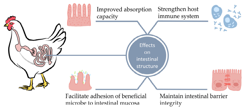 Poultry health status and improved growth efficiency are strongly correlated with the gut condition and intestinal microflora. The intestines play a very important role in the digestive tract of birds as they harbor a diverse community of beneficial microbes, which degrade complex nutrient compounds into simpler molecules that are more easily assimilated and metabolized [53,54]. The structural organization and adherence properties of the gastrointestinal epithelial cells are crucial for nutrient absorption and the protection of the bird's body from pathogenic microbes that could infiltrate the bloodstream [55]. The most important parameters associated with the higher nutritional absorption resulting from larger surface area available for nutrient assimilation are those related to intestinal morphology, i.e., increased villus height, a lower crypt depth, and the higher villus height to crypt depth ratio [56]. Sound gastrointestinal microbiota is the prime requirement for avoiding microorganism infections in the gastrointestinal tract of birds. This is achieved by preventing microorganism colonization through pathogenic bacteria antagonism, inhibition of adhesion sites in the gut and impediment to bacterial exercises [57]. Similarly, another marker of gastrointestinal health status is the amount of gastric mucosa, which produces mucin and prevents pathogenic organisms from adhering to mucosal surfaces [58]. Even though the intestinal microflora is relatively stable, it is still affected by numerous environmental factors (feed composition, hygienic standards, physical stress, etc.) and overall health condition of the animal. However, the key element with the greatest impact on intestinal microflora is diet. Probiotics are commonly used for intestinal flora regulation [59] and improvement of gastrointestinal histomorphology; however, the potential effects may slightly differ from one strain to another [60]. Dietary supplementation of broilers with Lactobacillus plantarum and Lactobacillus reuteri significantly affected barrier activity and reduced colonization by certain opportunistic or pathogenic microorganisms [61].