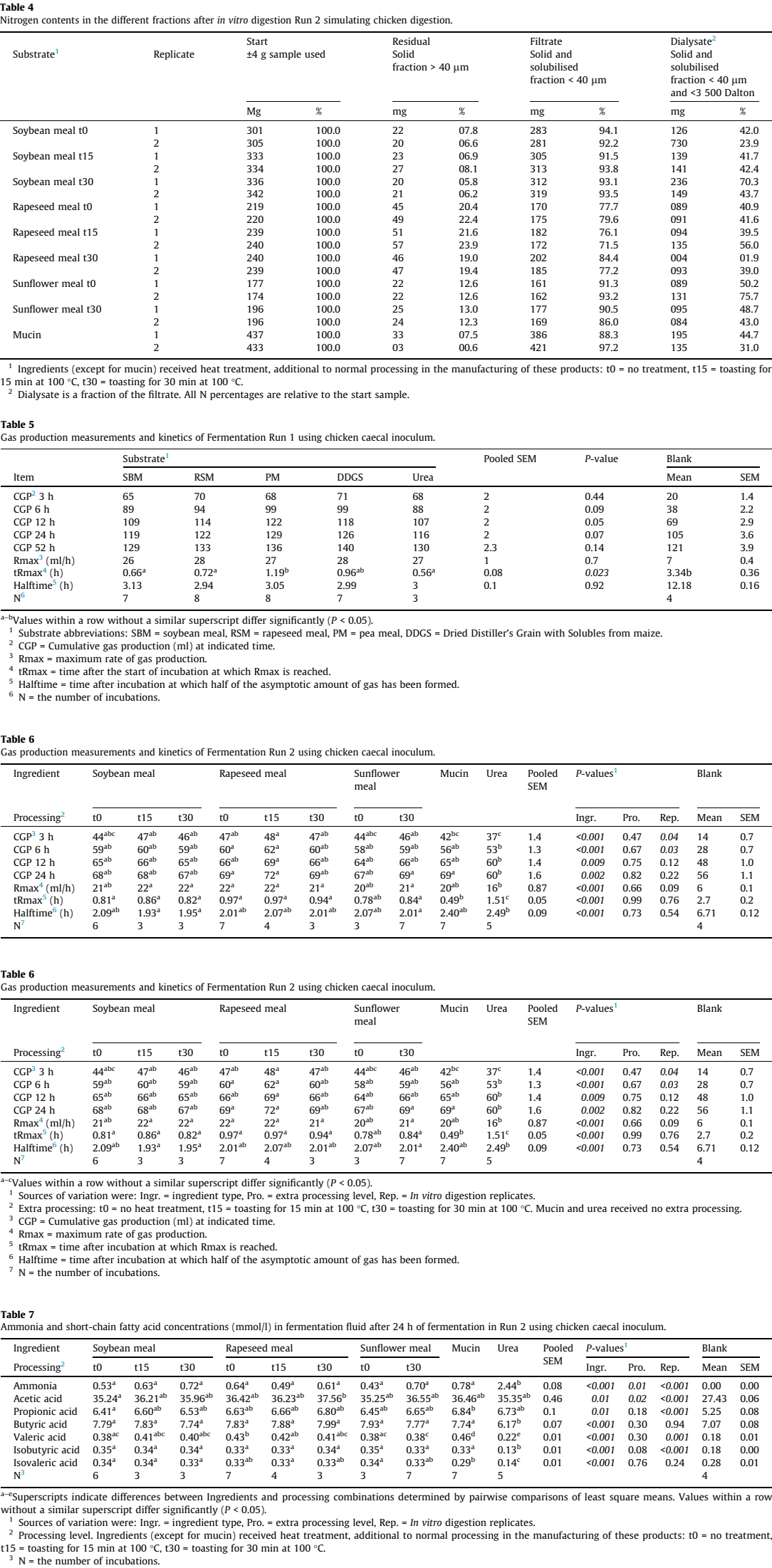 Gas production parameters show that GP from urea incubations was generally slower than of that the predigested ingredient fractions (Table 6). No differences were found between the different processing levels of ingredients. No differences were found between digestion replicate pairs of the same ingredient and processing combination, despite a significant overall model effect of digestion replicate for cumulative GP at 3 and 6 h. All substrate types showed a greater GP than the blank incubations (P < 0.01 for all timepoints, Rmax, tRmax and halftime).