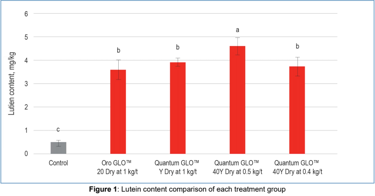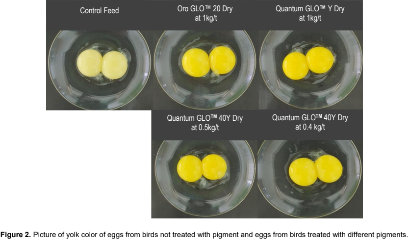 A layer trial was conducted at Bangkok Animal Research Centre (BARC), Thailand, to compare the bioavailability of marigold oleoresin yellow pigment and the effect of Oro GLO™ Y Dry, Quantum GLO™ Y Dry and Quantum GLO™ 40Y Dry on egg yolk pigmentation. The results showed that layers supplemented with a dietary feed treated with the new microemulsion product, Quantum GLO™ 40Y Dry at 0.5 kg/t, had numerically higher Yolk Color Fan (YCF) scores compared to Quantum GLO™ Y Dry and Oro GLO™ 20 Dry at the 1 kg/t inclusion rate of carotenoids. The YCF scores of Quantum GLO™ 40Y Dry, Quantum GLO™ Y Dry, and Oro GLO™ 20 Dry were 6.45, 6.33, and 5.95, respectively, after the pigment supplementation diet for 6 weeks. There were no significant differences in YCF score after feeding 1 kg/t Oro GLO™ 20 Dry (positive control) against 0.4 kg/t Quantum GLO™ 40Y Dry, which has 20% lower xanthophylls content compared to Oro GLO™ 20 Dry. The lutein content of eggs supplemented with Quantum GLO™ 40Y Dry at 0.5 kg/t has the highest level at 4.62 mg/kg, followed by eggs supplemented by Quantum GLO™ Y Dry at 1 kg/t with 3.94 mg/kg and Oro GLO™ 20 Dry at 1 kg/t at 3.61 mg/kg. The Lutein content of Quantum GLO™ 40Y Dry at 0.4 kg/t with 3.75 mg/kg was comparable to the lutein content of Oro GLO™ Y Dry at 1 kg/t treatment. The lutein results and the bioavailability evaluation showed that the new microemulsion Quantum GLO™ 40Y Dry enhanced the lutein absorption in the birds. These results indicated that the new pigment with microemulsion formulation has higher bioavailability compared to the Oro GLO™ 20 Dry without any adverse effect on feed conversion ratio (FCR), egg production, egg weight, mortality and feed intake.