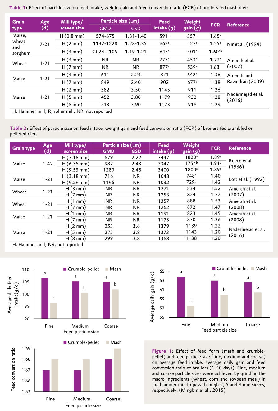 Grinding, mixing and pelletization are the key processes in poultry feed production. These processes have direct effect on feed quality, feed intake (FI) and poultry performance. Grinding is most typically associated with the size reduction of cereal grains. It is extensively studied that particle size and grinding of raw materials have major impact on mixing and pellet quality. Particle size also plays important role on the development of gastrointestinal tract (GIT) and growth performance of broilers. Generally, reduction in particle size leads to higher ingredient surface area to interact with digestive acids and enzymes which ultimately improves digestibility. The practice of feeding whole grains to broilers along with balanced concentrate is increasing acceptance in certain regions, including Europe, Canada, Australia and New Zealand. The main driver of this practice is the potential of reducing feed cost by eliminating the grinding step. It has also positive effects on poultry health and welfare. This review summarizes the results of different trials on effect of particle size and whole grain feeding on growth performance and gut health of broilers.