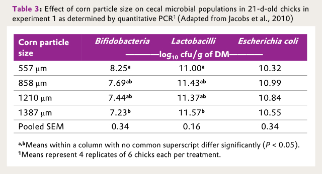 Particle size also affects the intestinal tract segments other than the gizzard, but results are contradictory. Amerah et al. (2007) reported non-significant change in villus height, crypt depth, and epithelial thickness in the duodenum with increase in maize particle size. However, Liu et al. (2006) and Xu et al. (2015) reported positive effect of coarse maize on intestinal morphology. The inclusion of coarse maize reduced the number of mast cells in the duodenum, jejunum, and ileum compared with finely ground maize (Liu et al., 2006). Reduction in mast cell in the small intestine is beneficial. Increase in mast cell numbers reflects Eimeria infection in broilers (Morris et al., 2004). Particle size of ingredients also affects the intestinal microbiota profile. Jacobs et al. (2010) reported change in cecal microbiota profile with use of different corn particle sizes (Table 3). The Lactobacilli population was significantly increased (P < 0.05) when the largest corn particle size of 1,387 μm was included in the diet. Increase in Lactobacilli concentration is considered to be beneficial because it can prevent colonization of pathogens such as E. coli (Engberg et al., 2002). The Bifidobacteria population was significantly decreased with increasing corn particle size from 557 μm to 1,387 μm. However, E. coli population was not affected by corn particle size. Singh et al. (2014) also found that the counts of Lactobacillus and Bifidobacteria species increased and those of Clostridium, Campylobacter and Bacteroides species were decreased with increasing inclusion levels of coarse maize (0 to 600 g/kg). Coarse mash diets can also increase the Lactobacilli population in the ceca and rectum (Engberg et al., 2002). It can be concluded that large particle size not only influence the GIT development but also change the cecal microbial populations. Large particle size increases the Lactobacilli counts and reduces the pathogenic bacteria in the caecum of broilers. Gracia et al. (2016) tested the effect of whole wheat and oat hulls addition in pellet and mash diets on GIT development and Campylobacter jejuni in cecum. Whole wheat and oat hulls in mash diets significantly reduced cecal Campylobacter jejuni colonization at 42 days whereas no clear reduction was observed for pellet diets.