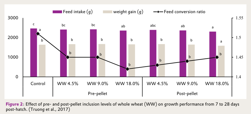 Whole grain can be incorporated in poultry feed either pre or post steam pelleting and offered as either intact pellets or as a whole grain pelleted concentrate blend (Moss et al., 2018). In New Zealand, whole wheat is usually incorporated into broiler diet prior to steam pelleting whereas in Australia, whole wheat is added post pelleting. Effect of pre- and post-pellet inclusions of whole wheat in broiler diet on growth performance is presented in Figure 2 (Truong et al. 2017). The post-pellet inclusion of whole wheat in broiler diets had greater impacts compared to pre-pellet inclusions. Relative to ground grain control diet, post-pellet whole wheat inclusion increased relative gizzard weight, reduced gizzard digesta pH and reduced incidence of dilated proventriculus. The FE was significantly improved in all whole wheat included diets (pre- and post-pellet).