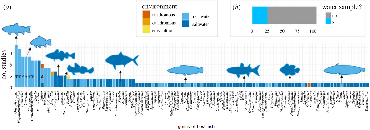 Figure 1. (a) Number of studies on the gut microbiome using NGS broken down by the genus of fish that the study was conducted on, as well as the environment those fish same from. Asterisk represents salmonid, carp and talapia. (b) The number of studies that assessed the water microbial communities. Gut microbiome studies were compiled using Web of Science [4] and only include studies that implemented NGS. It is acknowledged that total microbiome research extends further than this. Further information on search terms and filtering can be found in the electronic supplementary material. (Online version in colour.)