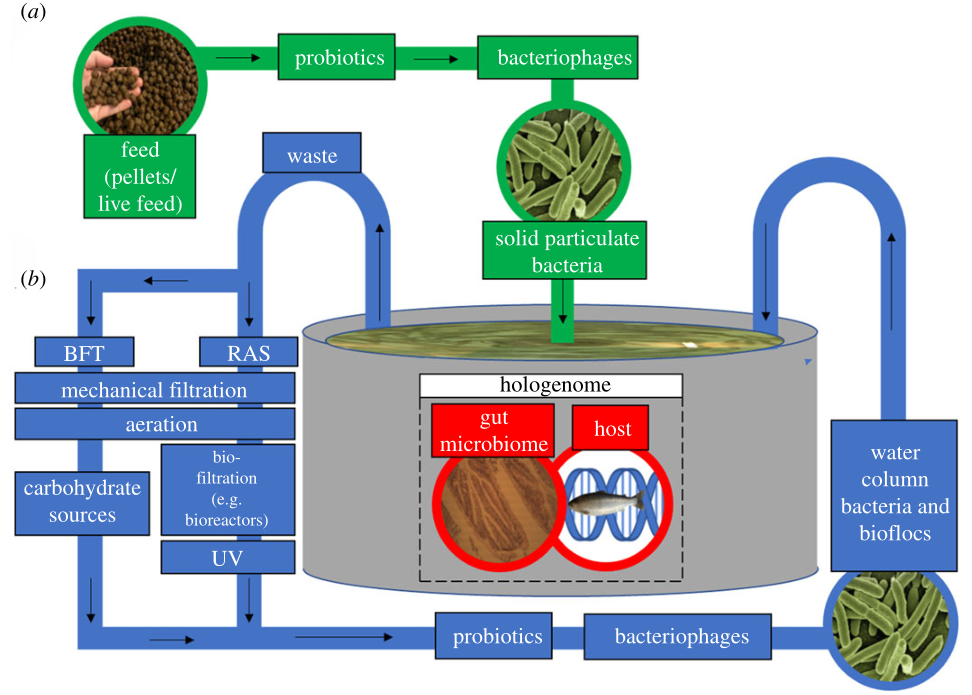 Finally, there are many areas in which synergies between gut microbiomes and aquaculture can be made. These have been highlighted through the review, but, in summary, include a better understanding of the gut microbiome with respect to insect-based feeds, vaccination, mechanismofpro-andprebiotics, artificial selection on the hologenome, in-water bacteriophages in RAS/BFT, physiochemical properties of water and dysbiosis as a biomarker.