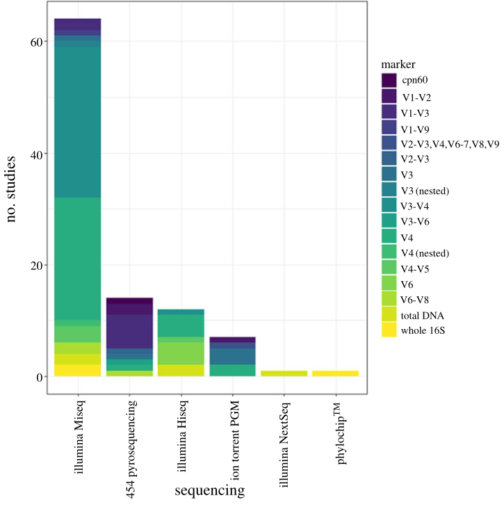 Figure 5. Methodological approaches used in high-throughput sequencing of fish gut microbiomes, broken down by the type of sequencing platform and genetic marker. Marker types are predominantly variable regions (V) within the 16S ribosomal RNA gene. Further information on search terms and filtering can be found in the electronic supplementary material. (Online version in colour.)