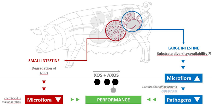 Non-digestible carbohydrates may be fermented by microbial populations along the gastrointestinal tract to synthesize short-chain fatty acids that may be absorbed and metabolized by the pig. Such indigestible carbohydrates consist of specific disaccharides, oligosaccharides, resistant starches, and non-starch polysaccharides. The presence and composition of these indigestible carbohydrates in pig diets vary based on the types of feed ingredients incorporated into their meals (Navarro et al., 2019). Xylanase works on the hydrolysis of the arabinoxylan fraction of NSPs. The NSPs present in the walls of plant cells encapsulate nutrients, making them unavailable for the action of the animal's own digestive enzymes. Moreover, NSPs exhibit a high affinity for water within the gastrointestinal lumen, leading to elevated digesta viscosity. This increased viscosity reduces gastrointestinal motility, facilitating an environment conducive to the proliferation of pathogenic microflora (Choct, 1998). The advantageous outcomes of enzyme supplementation arise from the enzymatic disruption of intact cellular membranes, leading to the release of sequestered nutrients, or are a consequence of modifying the physicochemical properties of non-starch polysaccharides, due to changes in viscosity and water-holding capacity and/or changes in the composition and content of bacteria in the intestine (Bedford, M. R., & Classen, 1992).