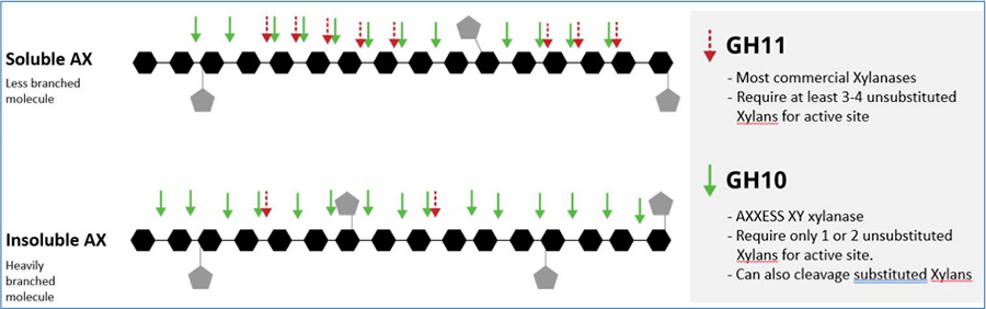 These enzymes specifically cleave the 1,4-β-D-xylosidic bonds in arabinoxylans, randomly targeting xylose linkages within the xylan structure. Each enzyme type has a unique pattern of degradation (Collins et al., 2005) and GH 10 xylanases specialize in breaking down arabinoxylans with high arabinose substitution into smaller oligosaccharides. These oligosaccharides are valuable for fermentation, serving as energy sources or prebiotics.