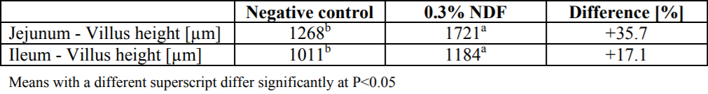 Villus height in the jejunum and ileum of birds at 39 days showed a significant increase in birds fed 0.3% NDF compared to controls (Table 1).