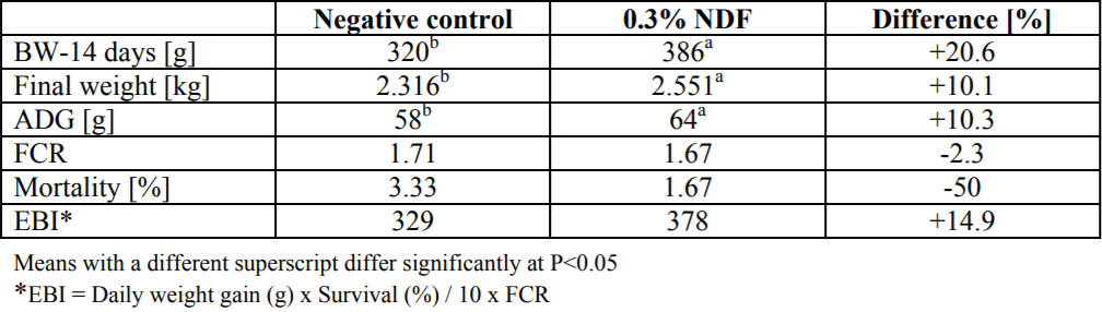 A trial to prove this concept was conducted at a research farm in Taiwan using 120 day-old male Arbor Acres broilers, randomly allotted into 2 treatment groups, with 3 replications and 20 birds in each pen. The commercially available corn-soy-based feed in one group contained 0.3% Formi NDF while the other group served as a negative control. Feed and water were provided ad libitum. Birds were weighed individually after 14 and 39 days; feed consumption was recorded per pen at the end of the trial. The effects of sodium diformate on performance (final weight, feed conversion ratio, European Broiler Index EBI), protein utilization and villi height were examined after 39 days, giving a measure of the overall gut status.