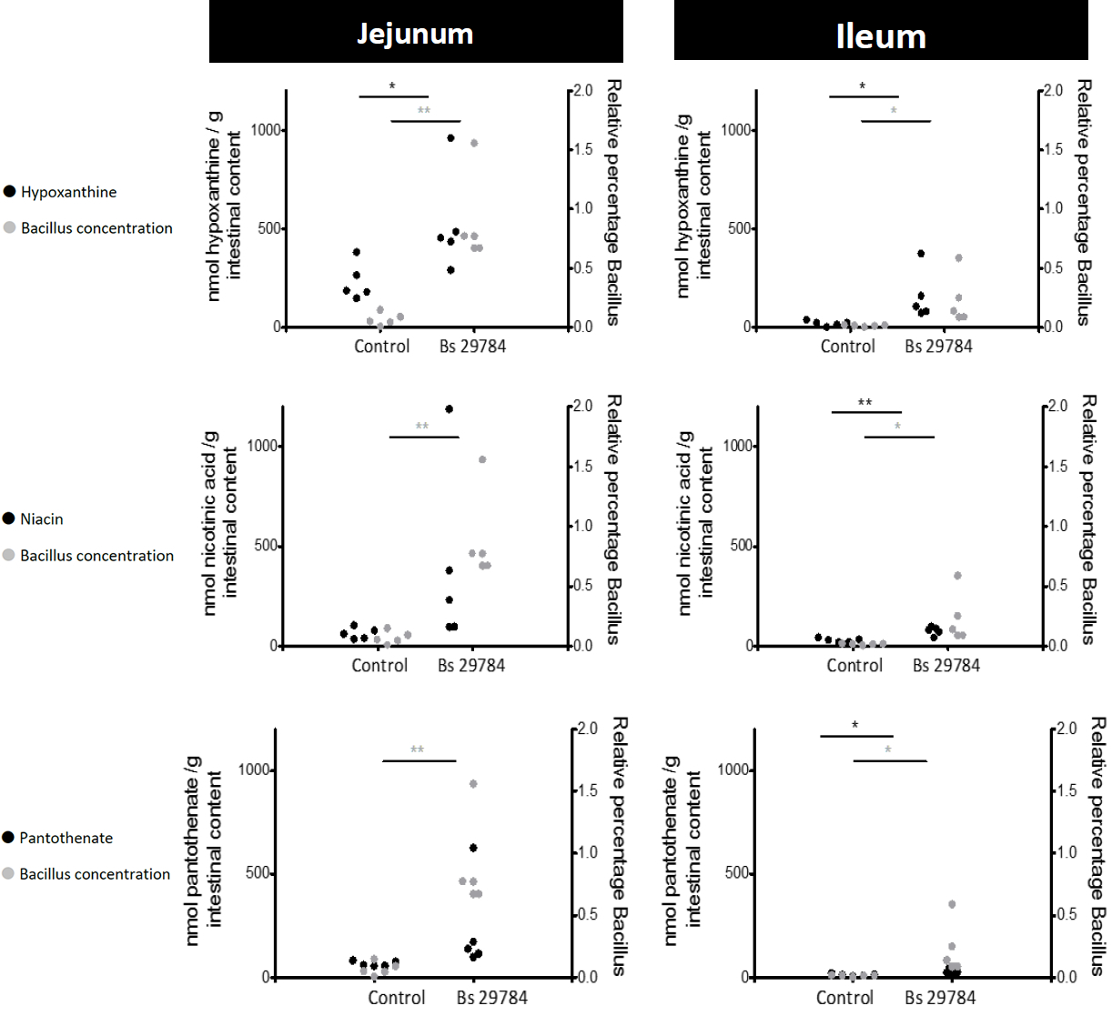 Germination is followed by production of various metabolites. For example, in an in vitro experiment, high and consistent quantities of three metabolites (niacin, pantothenate, hypoxanthin) were identified and produced by Alterion®. The concentration of those metabolites was then measured in digestive contents of birds receiving Alterion®, further proving that the concentration of these metabolites was strongly related to the number of Bacilli detected (Figure 2).